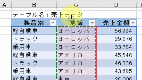 テーブル範囲の左隅にカーソルを置くと↘がでてきますので、そこでクリックするだけで、全範囲をまるごと指定することができます