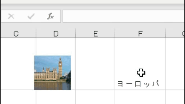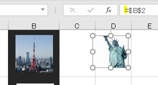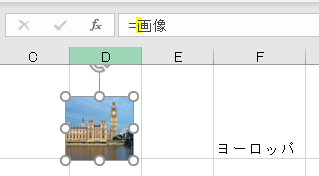 この画像をカメラで別な場所に映しだすと、下の画像のように数式バーでは「画像の入ったセル」を参照しています