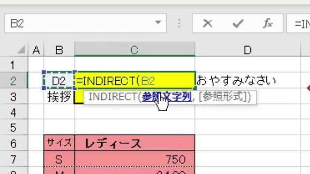 上のGIF画像のようにINDIRECT関数の引数としてB2セルを指定すると、D2セルの内容が出力されます