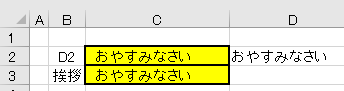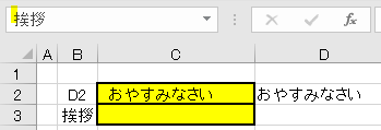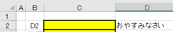 今、下の画像のようにD2セルに「おやすみなさい」と入力されているとします