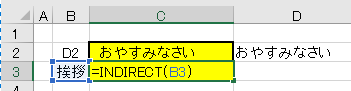そして、B2セルには「D2」と「おやすみなさい」の文字が入力されているセルの名称が入力されています