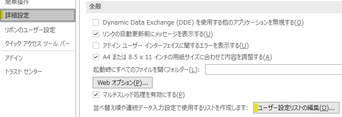エクセル画面の左上、ファイルタブから⇒オプション⇒詳細設定をクリックして、下までスクロールします