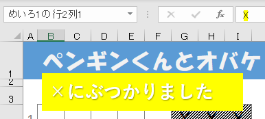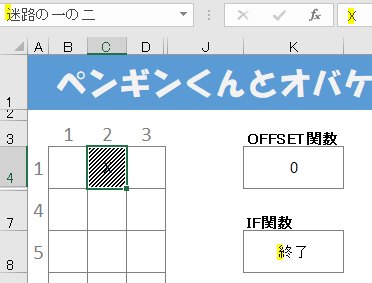 ですので、「迷路の一の二/C4セル」に”X”が入力されていると”終了”の文字を出力します