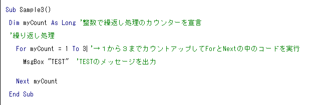 こちらのマクロは、実行するとカウンターとして設定した「myCount」が1から3まで増える間にメッセージボックスを3回繰り返し表示します