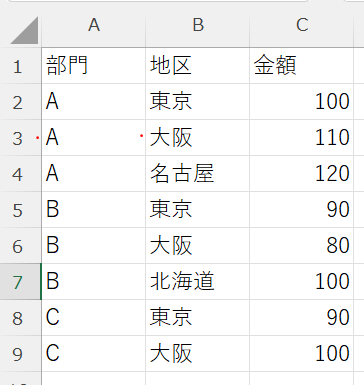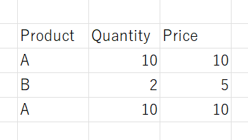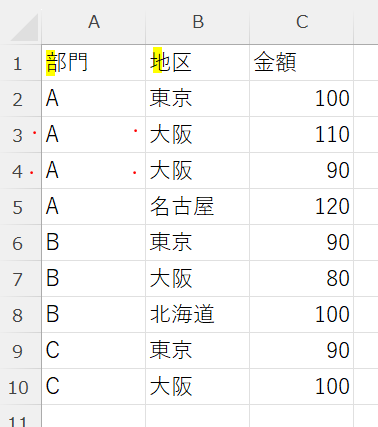 例えば、次の表を「A」「B」の2列で重複削除を行うとします
