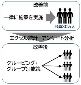 会員の1年間の購買履歴とアンケートの集計結果を分析し、会員のセグメンテーションを実施。それまで一律にマーケティング施策を行っていたが、会員のセグメント毎の施策(例:セグメント別の割引率設定など)を実施できるようになった