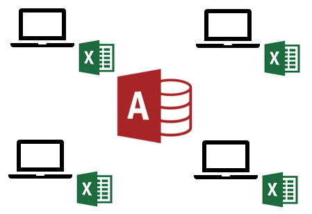 業務メンバー各自が業務に即したエクセルのクロス表を使用しながら、エクセルへの入力データはAccessファイルに蓄積して各自で共有する仕組みを構築